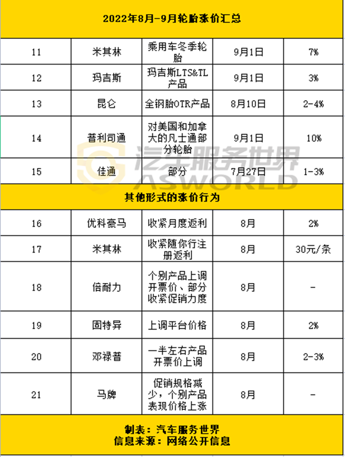 8-9月機(jī)油、輪胎漲價(jià)信息匯總
